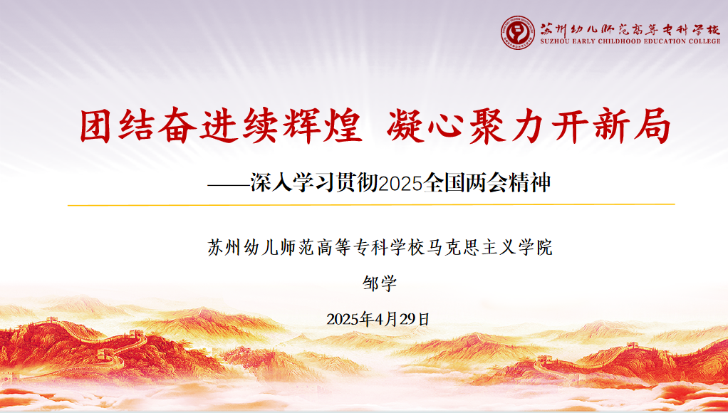 为深入领会2025年全国两会核心要义,4月29日苏州幼儿师范高等专科学校马克思主义学院邹学院长来园作专题宣讲报告。全体教师齐聚一堂,凝聚思想共识,汲取奋进力量。
