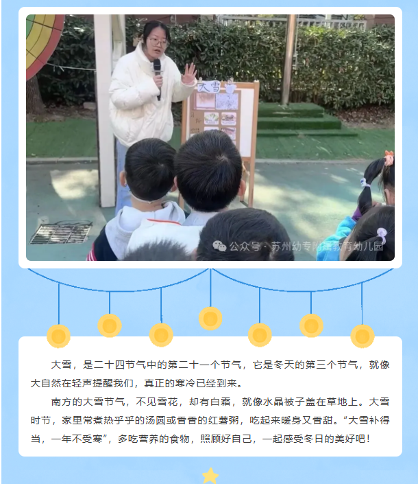 为让幼儿沉浸式感受传统时令节气特色,体悟姑苏街巷中蕴藏的风土人情与地方文化,苏州幼专附属教育幼儿园精心策划“师说•童话”系列晨会活动,于每周一清晨温暖开启。