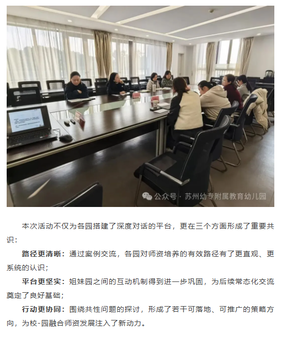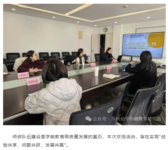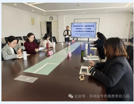 为深化校-园协同机制,推动教师队伍专业成长,2025年12月11日下午,苏州幼儿师范高等专科学校附属教育幼儿园成功承办了以“幼儿园师资团队示范辐射交流”为主题的校-园融合高质量发展师资建设共同体专题活动。来自花朵、教育、姑香苑、高铁新城实验幼儿园的业务园长与骨干教师齐聚一堂,围绕师资培养、示范引领、实践创新等核心议题展开深入交流与智慧碰撞。