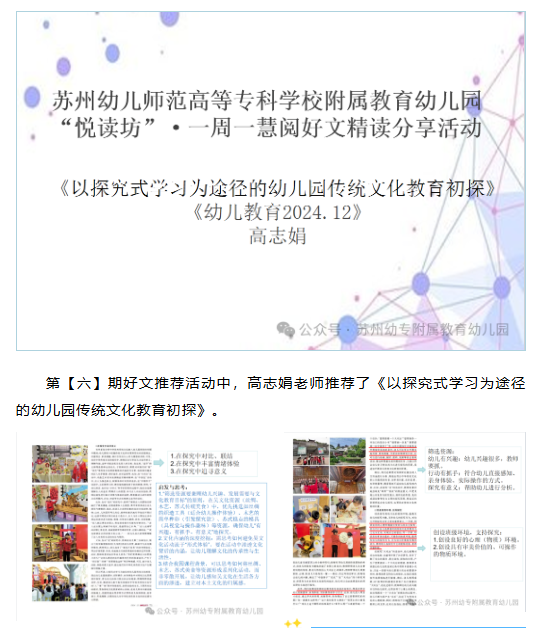 好的文章启迪智慧,震撼心灵。阅读带来的不仅仅是知识的积累,更是一种文化的传承和精神的升华。苏州幼儿师范高等专科学校附属教育幼儿园,围绕“悦读”积极设计家、校、社协同的阅读活动,让教师、儿童、家长,通过共读交流,在阅读中遇见“最美的样子”。